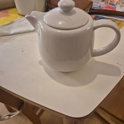 ASA-merkkinen valkoinen teekannu puisella kahvalla ja teesihdillä. Hyväkuntoinen ja vähän käytetty, ei naarmuja tai halkeamia.