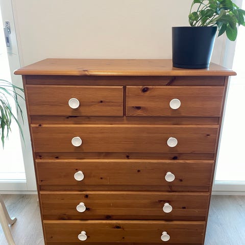Kotimainen Laulumaa Harmony lipasto jossa neljä leveää ja kaksi kapeampaa vetolaatikkoa. Väri luonnonvalkoinen (kerma) / mänty.