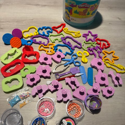 Läjä Play-Doh muovailuvälineitä ja muotteja. Setissä useita erivärisiä muotteja, leikkureita, rullia ja työkaluja muovailuvahan muotoiluun. Sopii lasten luovaan leikkiin ja erilaisten muotojen, hahmojen ja kuvioiden tekemiseen Play-Doh-muovailuvahalla.