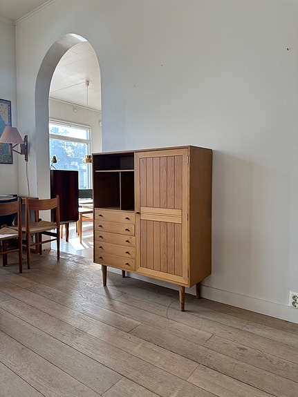 Kai Kristiansenin suunnittelemat tunnetut ’Z-tuolit’ eli model 42. Tuolien rungot ovat öljyttyä tammea ja kangas on uudelleen verhoiltu vaaleanvihreä verhoilukangas. Tuolit ovat täysin entisöidyt ja lähes kuin uudet.