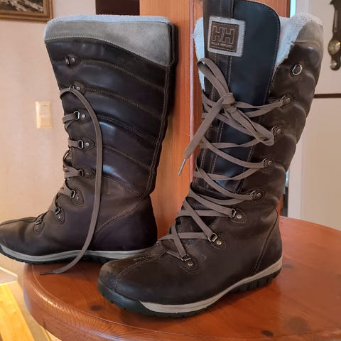 Helly Hansen vaelluskengät, koko 38. Kengissä on korkea varsi ja nauhakiinnitys. Väri on pääosin vaalea valko-sininen tummilla vahvikkeilla ja punaisilla yksityiskohdilla. Pohja on karkea ja kuvioitu, mikä tukee käyttöä epätasaisessa maastossa. Päällinen on synteettistä materiaalia ja kärjessä sekä kannassa on vahvistukset kulutusta vastaan. Soveltuvat retkeilyyn ja ulkoiluun.