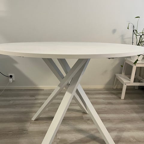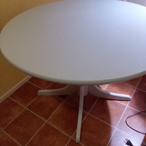 Vekeltä ostettu ruokapöytä. 110 cm halkaisijamitaltaan. Pöydän pinnassa jokunen pieni jälki, mutta yleisilmeeltään erittäin siisti!