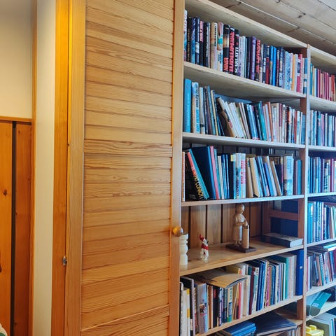 Lundian puurakenteinen kirjahylly.