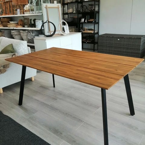 Ruokapöydän 20 mm kansi on valmistettu akaasiapuusta ja runko/jalat ovat metallia.