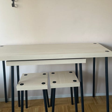 Täysin uudet työpöytä sekä tuoli myytäväksi sohvan tieltä. Pöytä upouusi. Tuoli myös vastikään ostettu, mutta maalipinnassa muutama pieni naarmu. Tuoliin teetetty puuvillapunoksinen istuinosa, jotta sopii kokonaisuuteen.