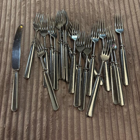 5 kpl Sorsakosken veistä ja haarukkaa. Haarukat: 18 cm pitkiä ja veitset 20,5 cm pitkiä. Kunto hyvä, käytön jälkiä on jonkin verran. Yhdessä haarukassa on logo, jota en tunnista (kts. lisäkuva).