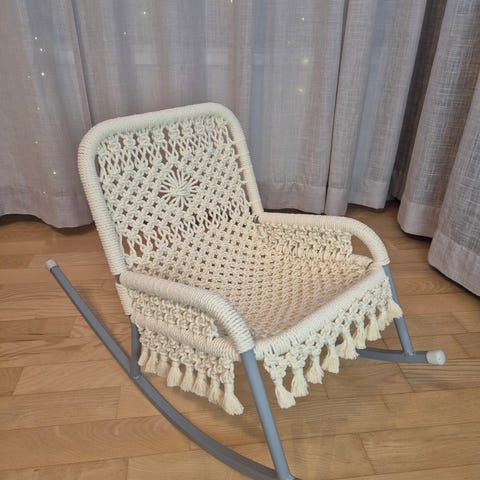Tukeva puuistuin ja käsinsolmittu puuvillanyöri.
