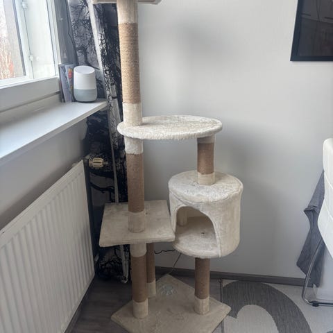 Monitasoinen harmaa raapimispuu kissalle. Useita tasoja, kaksi koppia ja riippuva pesä/lepopaikka. Tolpissa on narulla päällystetyt raapimiskohdat. Pehmeä kangaspäällyste tasoissa ja kopissa. Sopii kissan kiipeilyyn, leikkiin ja lepoon sisätiloissa.