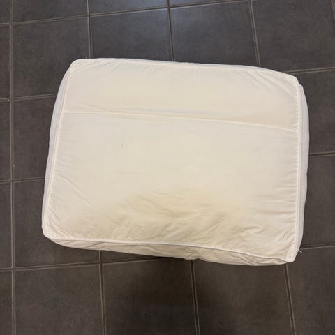 Myyntiin muuton vuoksi teetätetty pitkä tyyny. Päällisessä on toisessa lyhyessä sivussa vetoketju, joten sen saa pestyä.