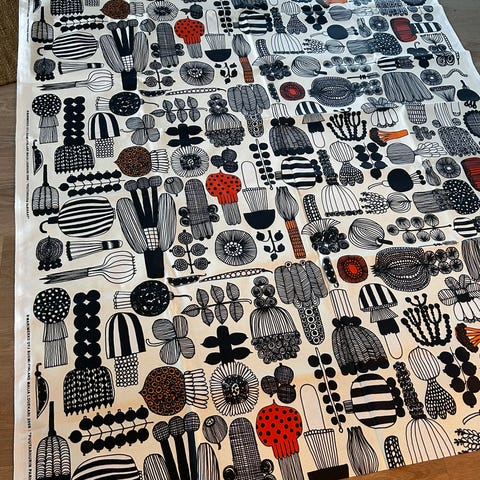 Siirtolapuutarha kuvioinen kangas, kestää kostealla pyyhkimistä. 25 € posteineen