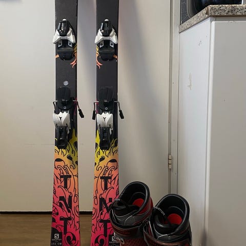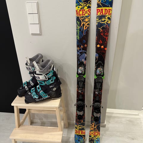 Laskettelusukset: Salomon Shogun Twintip sukset. Pohjat ja kantit ok käytetyssä kunnissa. Suksien pituus 130. Siteissä laajat säätövarat erikokoisia monoja varten