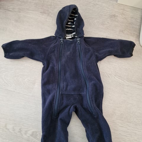 Käännettävät hihan- ja lahkeensuut. Hupun saa irti. Koko 62.