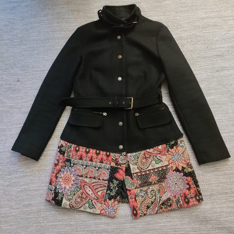 Musta villakangastakki jossa hihat osittain neulosta. Koko pieni 38, S/M. Materiaali 60% villaa.