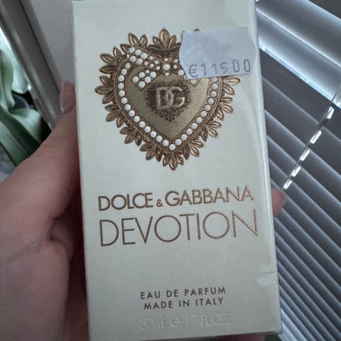 Dolce&Gabbana Devotion Edp 30 ml. Käyttöaste näkyy kuvasta. Ostettu viime marraskuussa. Hp 35 eur + pk-kulut 6,80 eur Matkahuollon kautta. Tuoksu Friisilässä Espoossa. Maksuna käy MobilePay tai tilisiirto.