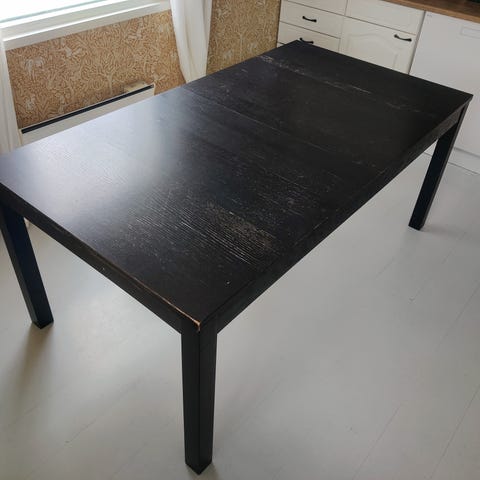 Pöydässä on kaksi jatkopalaa pöydän sisällä, joten kokoa on helppo muuttaa tarpeen mukaan. Ilman jatkoa pöytä sopii hyvin neljälle ja jatkettuna useammalle hengelle. Jatkopalat säilyvät pöydän sisällä kätevästi. Pöydässä perus elämisen jälkiä, mutta yksi isompi jälki löytyy kuvista. Itselläni plydällä aina tabletit, joten jälki on aina ollut peitossa.