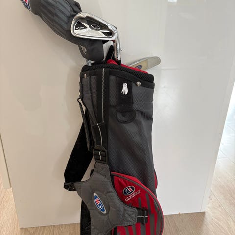 US Kids Golf juniorigolfmailat ja stand-bägi. Settiin kuuluu useita junioreille mitoitettuja golfmailoja sekä jalallinen stand-tyyppinen bägi. Bägi on pääosin musta oranssein ja valkoisin yksityiskohdin ja siinä on useita taskuja varusteille. Soveltuu junioripelaajalle golfharjoitteluun ja kierroksille.