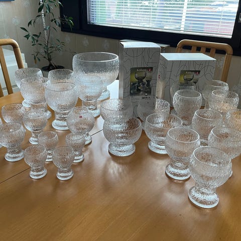 Iittala lasit kirkasta lasia. Paksupohjaiset, jalalliset lasit, joissa kohokuvioitu pinta. Sopivat esimerkiksi juoma- tai jälkiruokajuomien tarjoiluun.