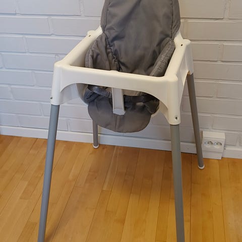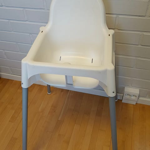 Hetken aikaa satunnaisesti lapsella ollut syöttötuoli. Istuin osasta lähtenyt pieni pala mustaa pinnoitetta. Syöttöpöytä ja vyötä tuolissa ei ole.