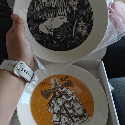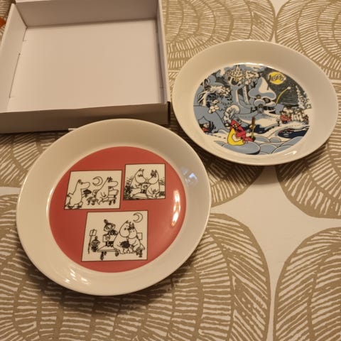 Arabian Muumi keräilylautasten osa 2/10, johon kuuluvat kuvan lautaset. Säilytetty laatikossa.