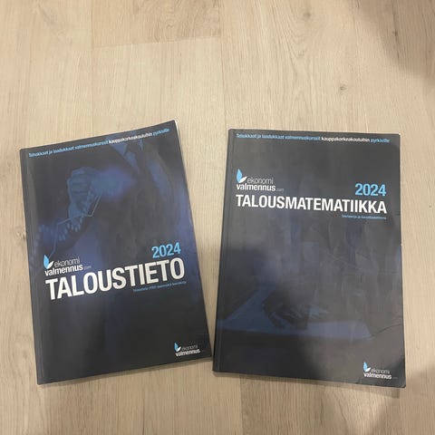 Siistissä kunnossa olevat teoriakirjat vuodelta 2025. Taloustieteen kirjassa ei merkintöjä ja matikassa 3. kuvan kaltaisia lyijykynämerkintöjä muutamalla sivulla. Matematiikan kirja sisältää myös harjoitustehtäviä.
