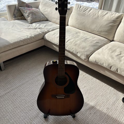 Yamaha F310P akustinen kitara. Teräskielinen dreadnought-mallinen akustinen kitara, jossa vaalea kansi ja tummempi sivu- ja pohjamateriaali. Sopii yleiskäyttöön esimerkiksi harjoitteluun ja säestämiseen. Kaulassa on metalliset virityskoneistot ja otelaudassa nauhat koko skaalaan. Kitarassa on pyöreä ääniaukko ja kiinteä tallaratkaisu teräskielille.
