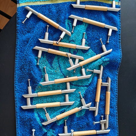 Puisia kaapin oven vetimiä halk. 4 cm ja kork. 4 cm. Punaruskeat renkaat on serveteille ja pyöreät kiekot verhotangon pätyjä. Tarjoa.