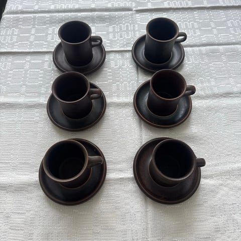 Arabian ruska astiasto. Teekannu, sokerikko, 8kpl mukeja ja 9kpl pieniä lautasia. Osassa enemmän kulumaa/väri haalistunut kuin osassa.