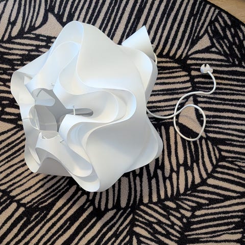 Valkoinen organza riippuvalaisin muovikristalleilla. Kuvun halk. 36cm kork. 24cm.