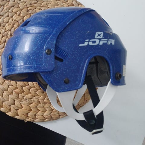 Hyvässä kunnossa oleva musta jofa merkkinen jääkiekkokypärä/luistelukypärä. Koko 50-57cm