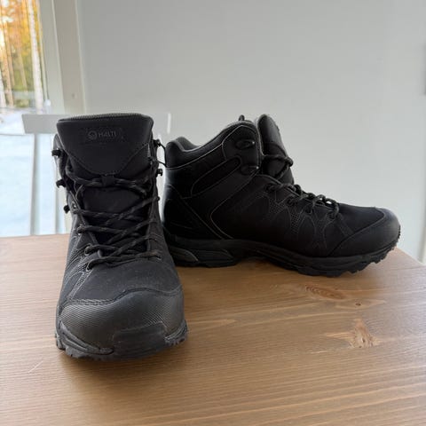 Tästä kevääseen: Halti varrelliset kengät, koko 41. Varren malli on nilkkaa tukeva ja kengissä on nauhakiinnitys. Väri on musta pinkeillä yksityiskohdilla ja vuorilla.