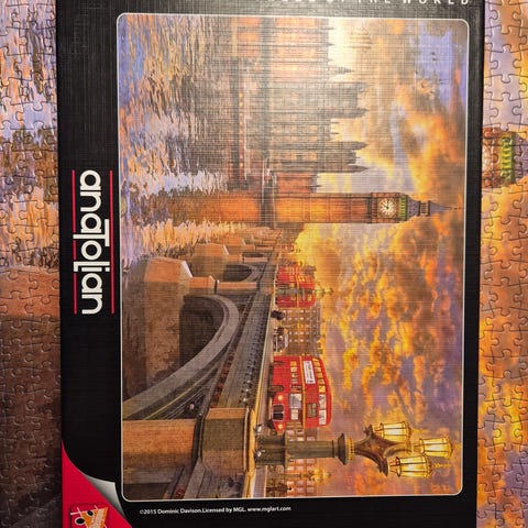 Kerran koottu maisema-aiheinen palapeli. Järveen heijastuva kuva oli tosi kiva koota. Yksi pala puuttuu (kuvassa). Palapelin merkki Tactic.