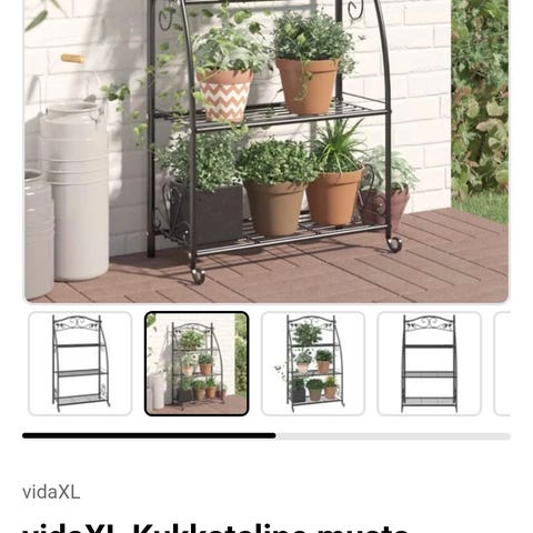 Vankka metallinen kukkahylly, jossa puiset hyllylevyt.