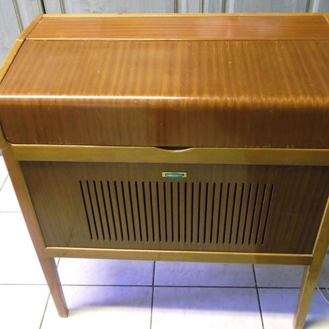Takapahvissa näkyy kosteusjälkiä, mikä on tyypillistä vanhoille putkiradioille.
