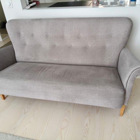 Todella tyylikäs sohva. Käsinojassa halkeama jota aikoinaan korjattu liimaamalla. Pienellä vaivalla saa kuntoon. Sohvaa pystyy kuitenkin käyttämään, vaikka nojaa ei korjaisi. Kuvissa näkyy myös pari pientä puutetta, jotka ovat enemmän esteettisesti häiritseviä, jos tarkasti katsoo. Tästä halvalla hienoa tyyliä kotiisi!