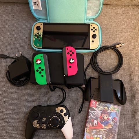 Nintendo Switch -pelikonsoli. Todella vähän käytetty ja kunto uuteen verrattavissa. Uudesta asti ollut näytönsuoja paikallaan. Mukaan Hori split bad pro ohjaimet.