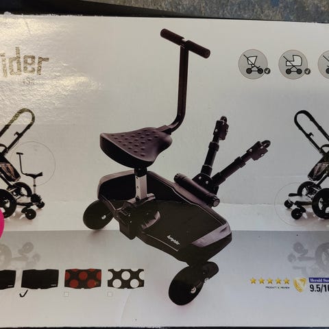 Vähän käytetyt Bumprider-seisomateline ja istuinosa. Kiinnikkeet käy useimpiin vaunuihin.