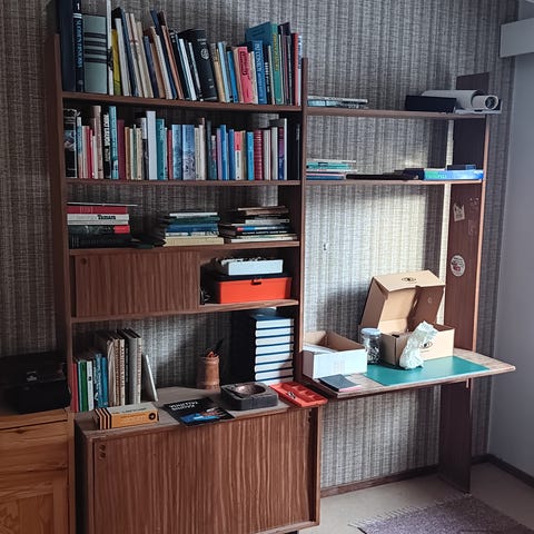 Aito 1970-lukulainen ja hyväkuntoinen kirjahylly. Löytyy lipastoa, kaappia ja vitriiniä. Neljä erillistä yksikköä. Näitä ei valmisteta enää. Maksimisyvyys on 40 cm, kirjahyllyjen syvyys 23,5 cm. Alimman tason korkeus 58 cm. Minusta tämä on hieno, mutta ei mahdu itselle kotiin.
