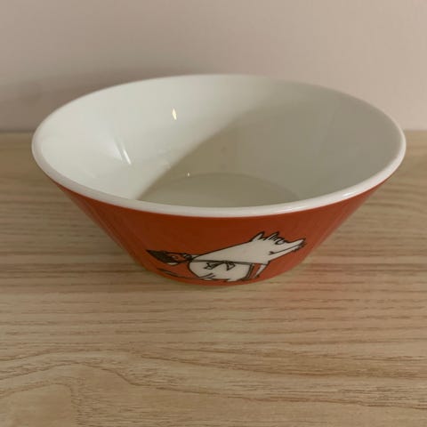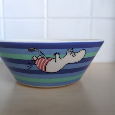 Myydään raidallinen Muumimamma-muumikulho Ruusutarha. Iän tuoma kuluma näkyy kuvissa.