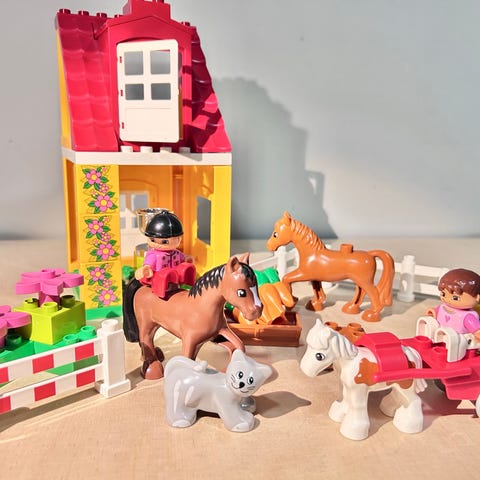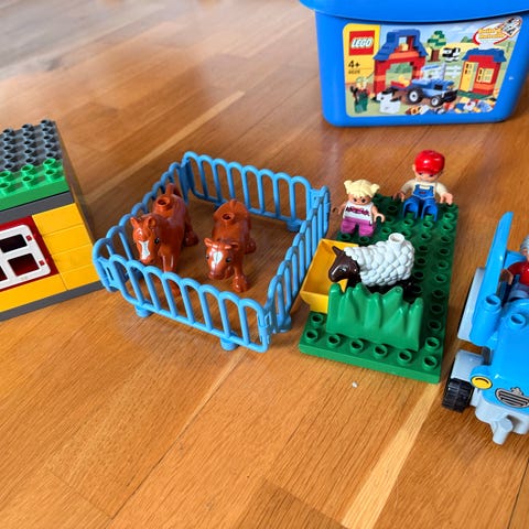 Pakkauksessa on Duplo-palikoista koottava pieni rakennus, jossa on ovi ja ikkuna, sekä useita eläinhahmoja, kuten lehmä, kana ja kissa. Mukana on myös pieniä lisäosia, kuten kasvi ja juoma-/ruoka-astia. Lapio puuttuu.