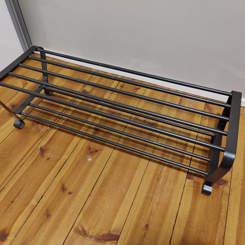 Ylimääräiseksi jäänyt kenkäteline. Muistaakseni Jyskistä ostettu. Ihan siistissä kunnossa, toki pieniä käytönjälkiä löytyy. Leveys 78cm, syvyys 34cm, korkeus 32,5cm.