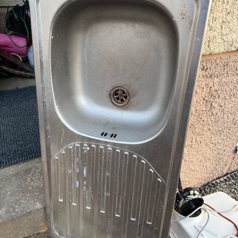 Tiskipöytä ”vanha kunnon rosterinen”. Koko noin 60x125cm. Kaksi allasta, alla puulevy. Siisti, ok kiilto. Irroitettu.