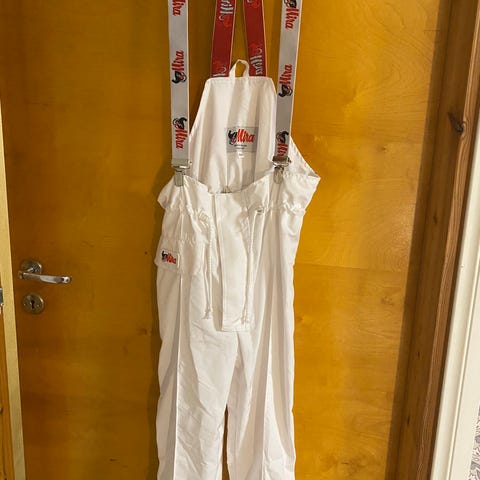 Wahlsten ajohousut, koko 56. Väri valkoinen. Housuissa on joustavat olkaimet, joissa Wahlsten-teksti, sekä joustava vyötärö. Lahkeissa on kuminauha ja kiinnike, joka auttaa pitämään lahkeet paikoillaan saappaiden tai kenkien päällä.