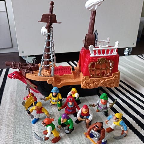 Pinypon merirosvosetti. Merirosvo baari,saari ja laiva. Hahmot ja settiin kuuluvat osat. Leikityssä ja siistissä kunnossa
