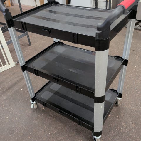 Metallinen siivousvaunu pyörillä. Rungossa on useita tasoja ja sivussa metallikori. Vaunussa on pyörät helpottamaan siirtelyä.