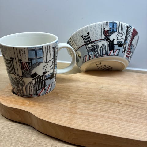 Arabia Muumi muki. Keraaminen muki, jossa keltainen pohjaväri ja Muumi-aiheinen kuvitus. Soveltuu juomamukiksi arkeen ja kattauksiin.