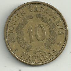 Suomen tasavalta 10 markkaa kolikko vuodelta 1935 pieni painoksinen vuosi. Toisella puolella on teksti ”SUOMEN TASAVALTA”, arvomerkintä 10 markkaa ja sitä ympäröivä koristeellinen seppele. Kääntöpuolella on Suomen vaakuna, vuosiluku 1935 sekä reunaa kiertävä koriste. Kolikko soveltuu esimerkiksi keräilyyn tai numismaattiseksi kohteeksi. hinta 5 e posti 2.50 e