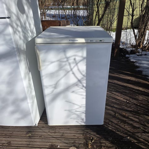 Suoraan käytöstä toimiva pakastin. Kahva puuttuu, muuten ehjä. Pinnoissa näkyy elämisen jälkiä, kyljessä tarroja. Leveys 55cm ja korkeus 145cm.