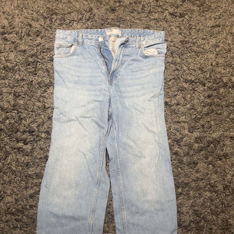 Bershka farkut miehille. Koko eur 38; men 30; USA 30vyötärökoko W30. Materiaali denim, väri sininen. Farkuissa on kulutettu ja revitty viimeistely edessä. Housuissa napeilla varustetut, irrotettavat henkselit. Housut uudenveroiset, lähes käyttämättömät.