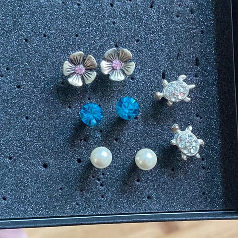 Hopeiset, roikkuvat kukkakorvakorut. Muuten erinomaisessa kunnossa, mutta koukut ovat hieman vääntyneet. Hopealeimat löytyvät, mutta ovat liian pienet kunnon kuvaan.