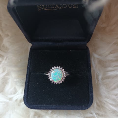Angelo Vetuston suunnittelma hopeasormus 925 leimalla, pienet platina kuviot. Painoa 2.40 g, Lightning Ridge Opaalin doubletti Australiasta, upealla värien leikillä.